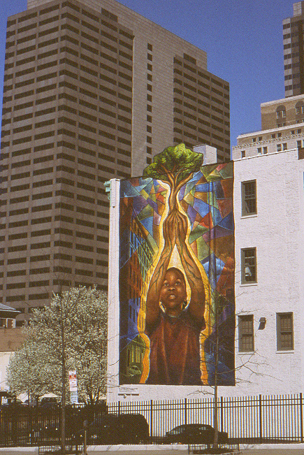 This mural shows the progress of equality in our nation over the years with slavery through the images of the different stages it took. YOu can spot the different backgrounds on all 3 levels, with the first one from the top being the most calming. The quote on the mural states, “WITH MALICE TOWARDS NONE, WITH CHARITY FOR ALL”
