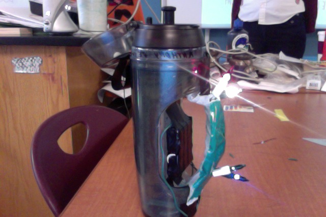 My project is a modified water bottle that lights at the hand strap. The battery rests covered between your hand space and the lights/strap. The lighting mechanism is the cap. When the cap is in an open position it turns on. I choose to do this because a lot of other people stole my ideas before I could plan them. My bottle was nearby and I got a quick bit of inspiration.