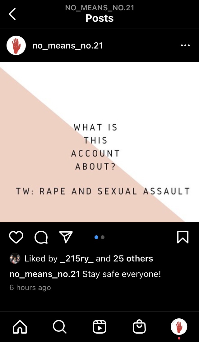 I want my followers and people I know to be able to protect themselves just in case anything happens. Rape and sexual assault could happen anywhere, which is why it is important to know these things. I learned a lot of things which is what I wanted. This was a very important and educational experience for me, yet sad to know that this is the world we live in. Even if my instagram account doesn’t get a big following, I know that I am contributing to changing the world. This was a very deep project for me, since I had to look into my experiences that I had in order to write this. Although I already knew that some things I went through stuck with me, while doing this project I realized how many times I’ve been sexually assaulted. At such a young age too. I don’t want other people to go through these types of things. I want people to know as much as possible so they can protect themselves and others. I’m actually proud of the outcome of this project. I don’t know what I would want to change. Even if this project is over, I want to at least have 10 posts on my account before stopping, so I will continue to post on it. I have a bit of followers right now, but hopefully, it grows, and hopefully my account does help people.