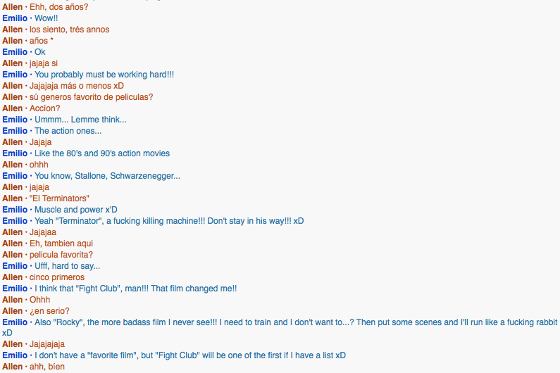 He had very fluent english, the guy likes videogames, not necessarily first person shooters. A fan of action movies, those much like The Terminator, also fight movies, his favorite is "Fight Club."How did this interaction help you move towards achieving your personal goal?