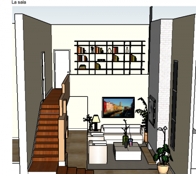 - Unas escaleras y una tele grande en la sala.