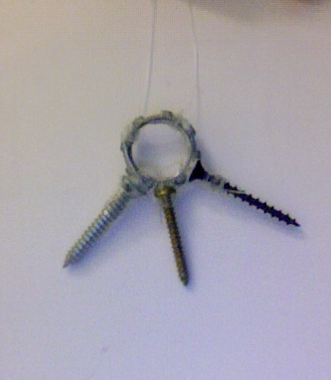 The first piece I created used nails and metal circles. I used the glue to connect the nails to the metal part, and used old fishing wire as a chain. The second piece I created used an old fish hook that I connected to my dogs old vaccination tag.