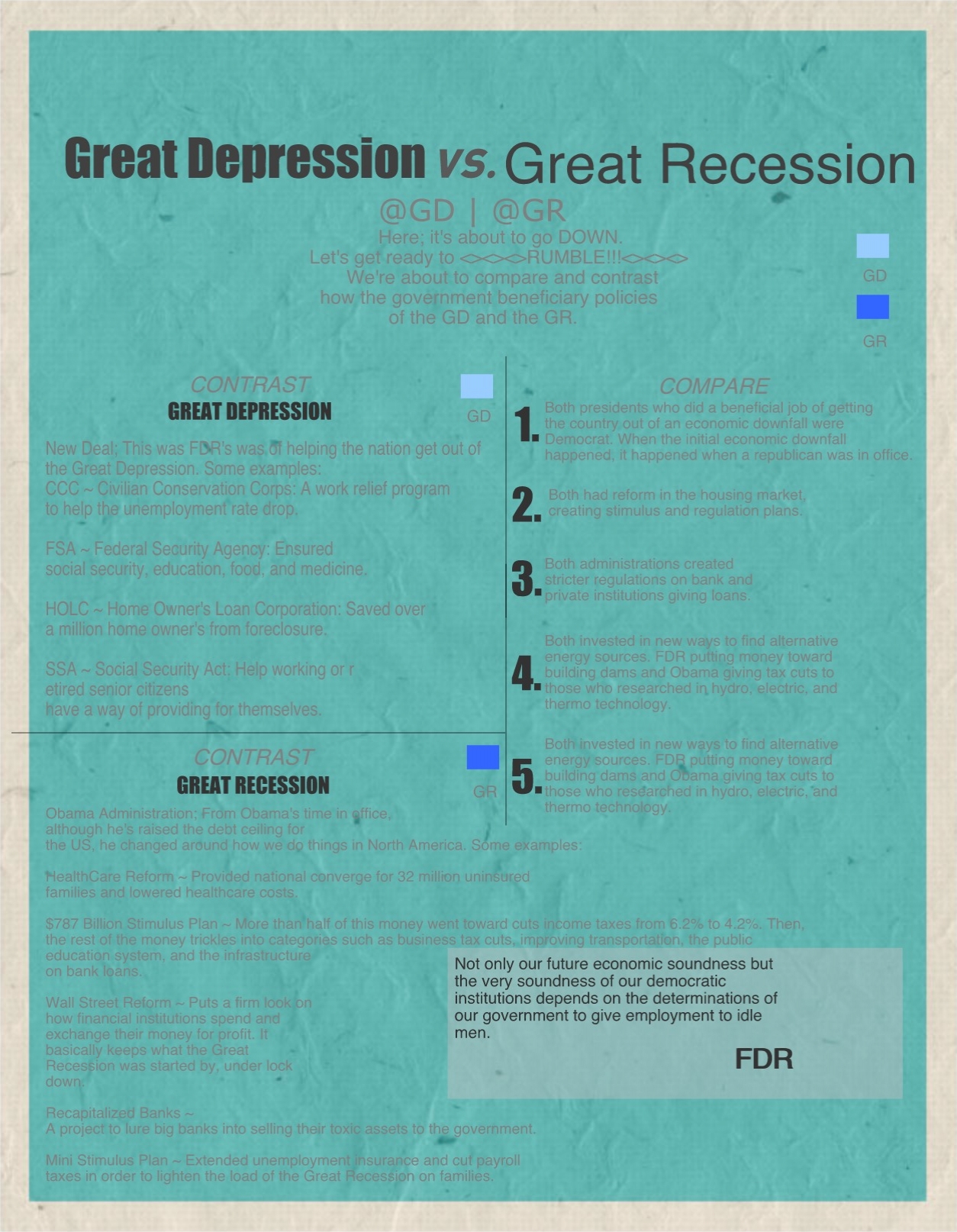- Here it basically explains the programs FDR planted what was yielded. It’s to show the different policies of Hoover and FDR. Either the government supports its people, or the people supporting the government. It’s about the programs FDK established, their effects, and how they it influenced a turnaround from the Great Depression.
