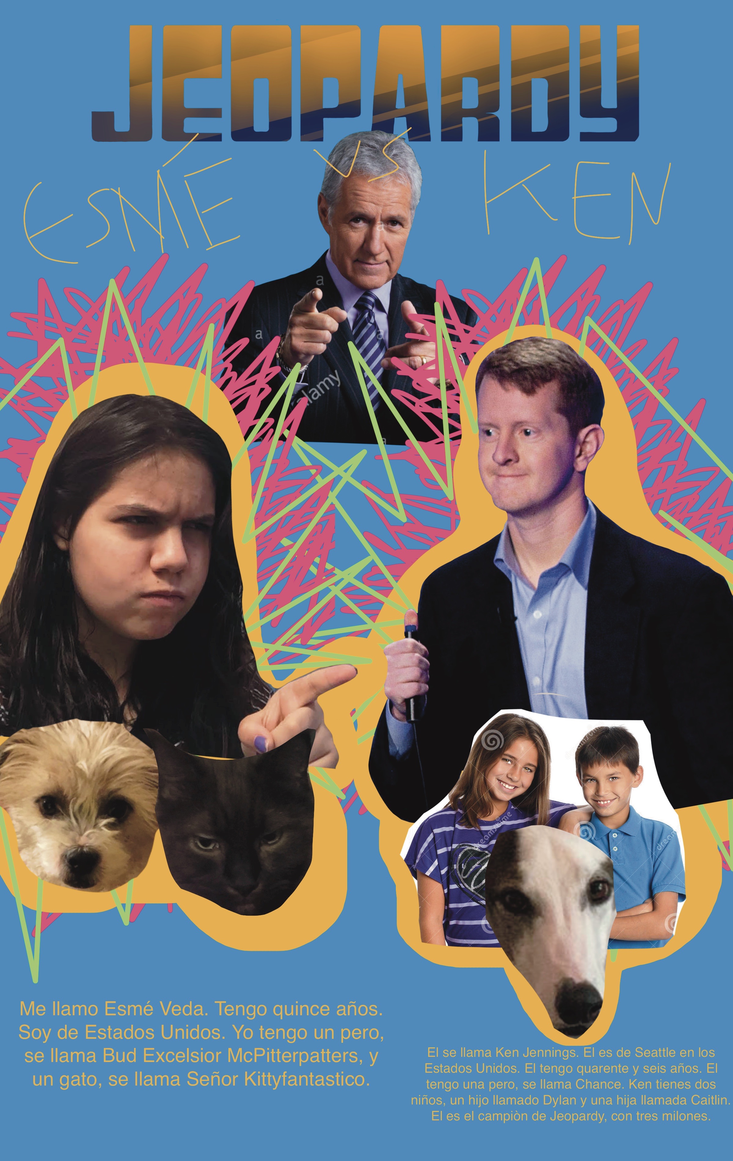 Mi familia es muy grande, pero yo no tengo hermanos. Yo tengo ocho tíos, todos vivo en Panáma excepto mi Tía Marie. En mi casa viven mi Madre, llaman Francesca, mi Padre, llaman Andrew, mi pero, mi gato y yo.