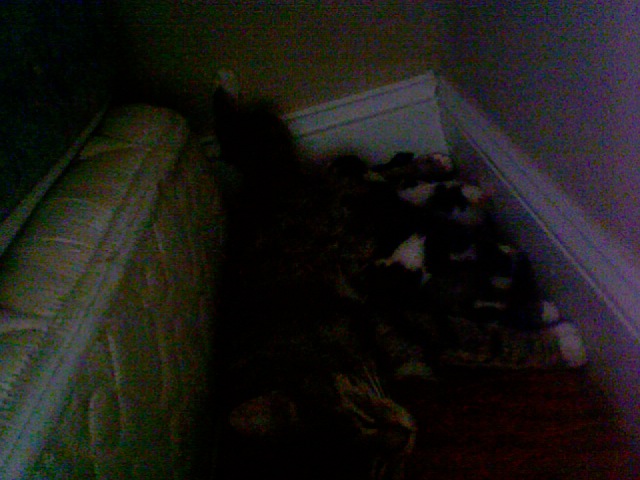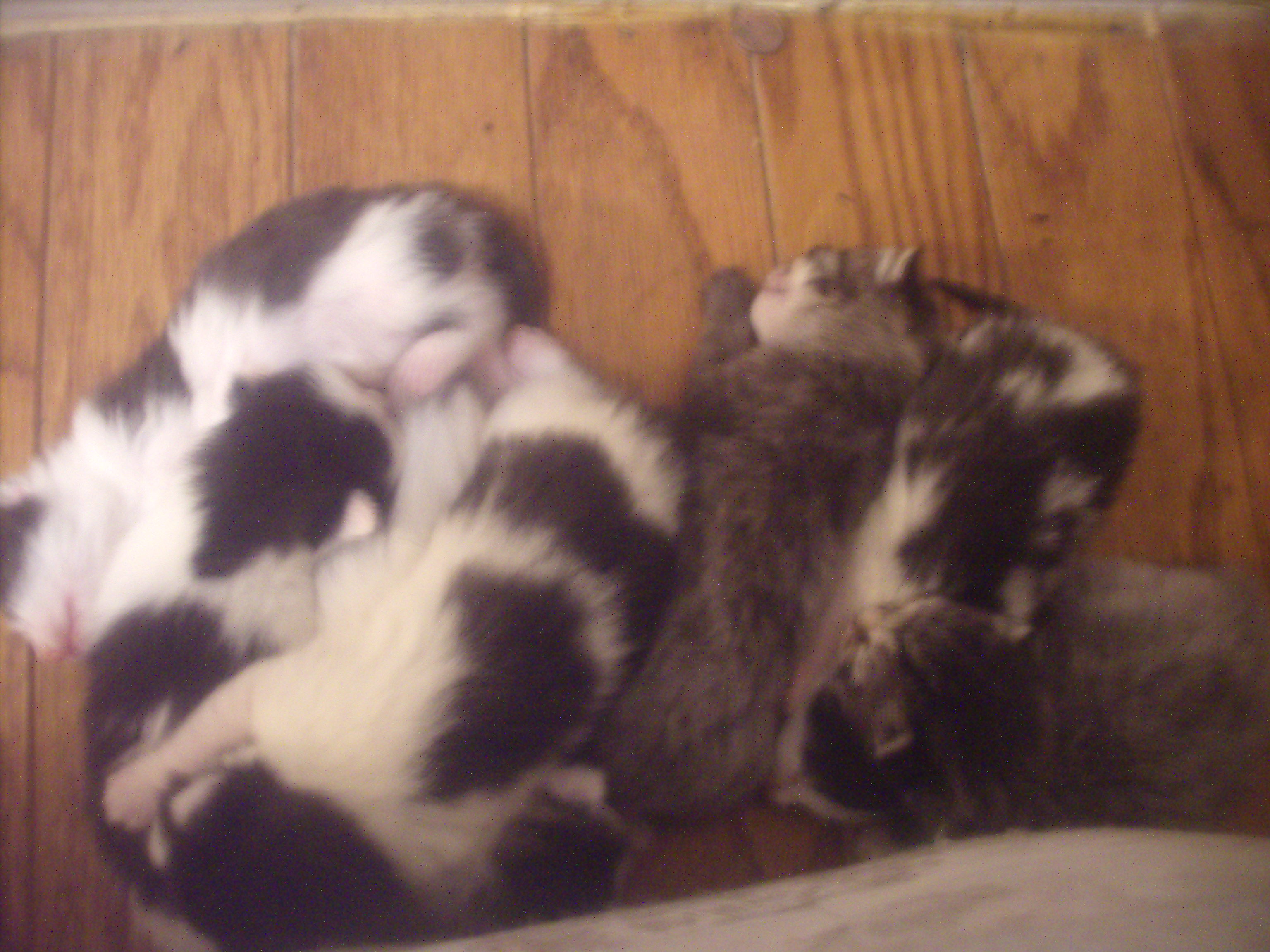 My cat moved the kittens to the side of my bed so at night they meow alot and it's a little annoying sometimes i wanna roll over and glare but when i see how cute they are i just can't be mad. Plus they're fun to watch when you don't have anything to do. They also have more fur now and it's not as slicked back as they were before the picture is dark but i'll take a few more later when it's a little brighter