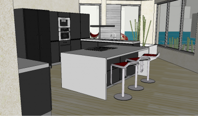 En la cocina, es pequeña. Está una mesa, un horno, una estufa, tres sillas, un lavamanos, un lavaplatos, un refrigerador, y dos microondas.