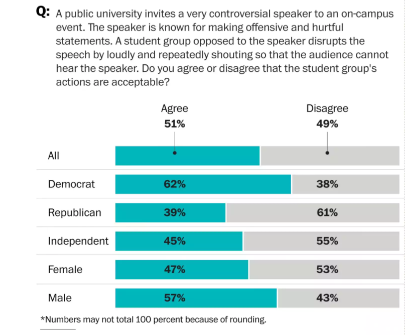 The New York Times and the Washington Post have similar ideas in their recent articles. The Washington Post article suggests that young people support free speech seemingly contrary to the story at Evergreen, but Evergreen can be used as a measure of the extreme, not the norm. The New York Times article cites a Gallup study for its evidence. There were several polls that stated/confirmed what we already knew, and some that went against our previous knowledge from the first blog post. First off, college students think that political conservatives are the least able group to openly express their views (69%), the next least able group is Muslims (80%). We already knew that many conservatives are less able to share their views. 10% of students say violence is acceptable to stop people from hearing controversial speakers. Some new information I have gathered is based on who feels “uncomfortable” on campus because they heard something about their race or ethnicity. Black and Jewish students are most likely to feel that way (43% Black) and (38% Jewish).