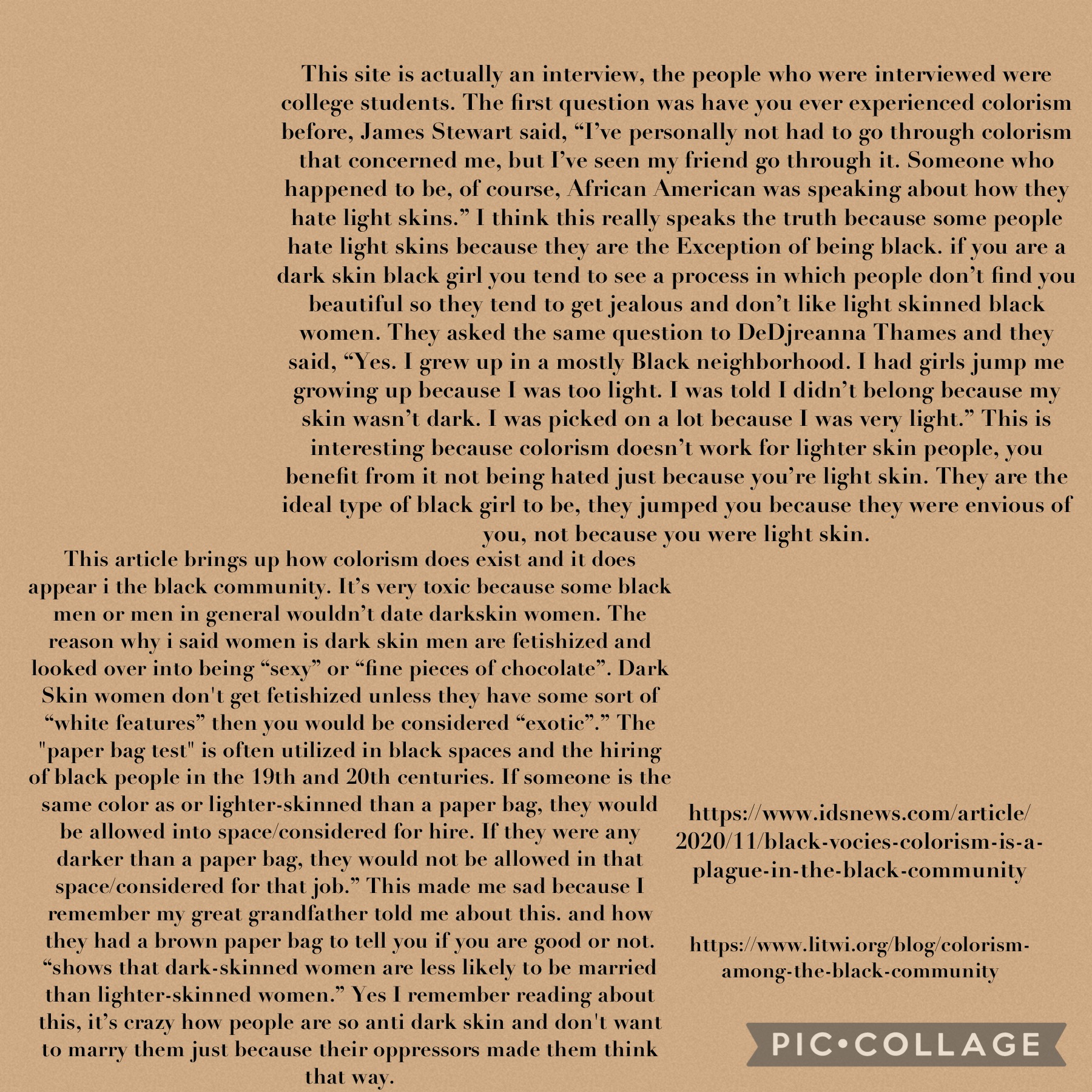 https://www.idsnews.com/article/2020/11/black-vocies-colorism-is-a-plague-in-the-black-community This site is actually an interview, the people who were interviewed were college students. The first question was have you ever experienced colorism before, James Stewart said, “I’ve personally not had to go through colorism that concerned me, but I’ve seen my friend go through it. Someone who happened to be, of course, African American was speaking about how they hate light skins.” I think this really speaks the truth because some people hate light skins because they are the Exception of being black. if you are a dark skin black girl you tend to see a process in which people don’t find you beautiful so they tend to get jealous and don’t like light skinned black women. They asked the same question to DeDjreanna Thames and they said, “Yes. I grew up in a mostly Black neighborhood. I had girls jump me growing up because I was too light. I was told I didn’t belong because my skin wasn’t dark. I was picked on a lot because I was very light.” This is interesting because colorism doesn’t work for lighter skin people, you benefit from it not being hated just because you’re light skin. They are the ideal type of black girl to be, they jumped you because they were envious of you, not because you were light skin.