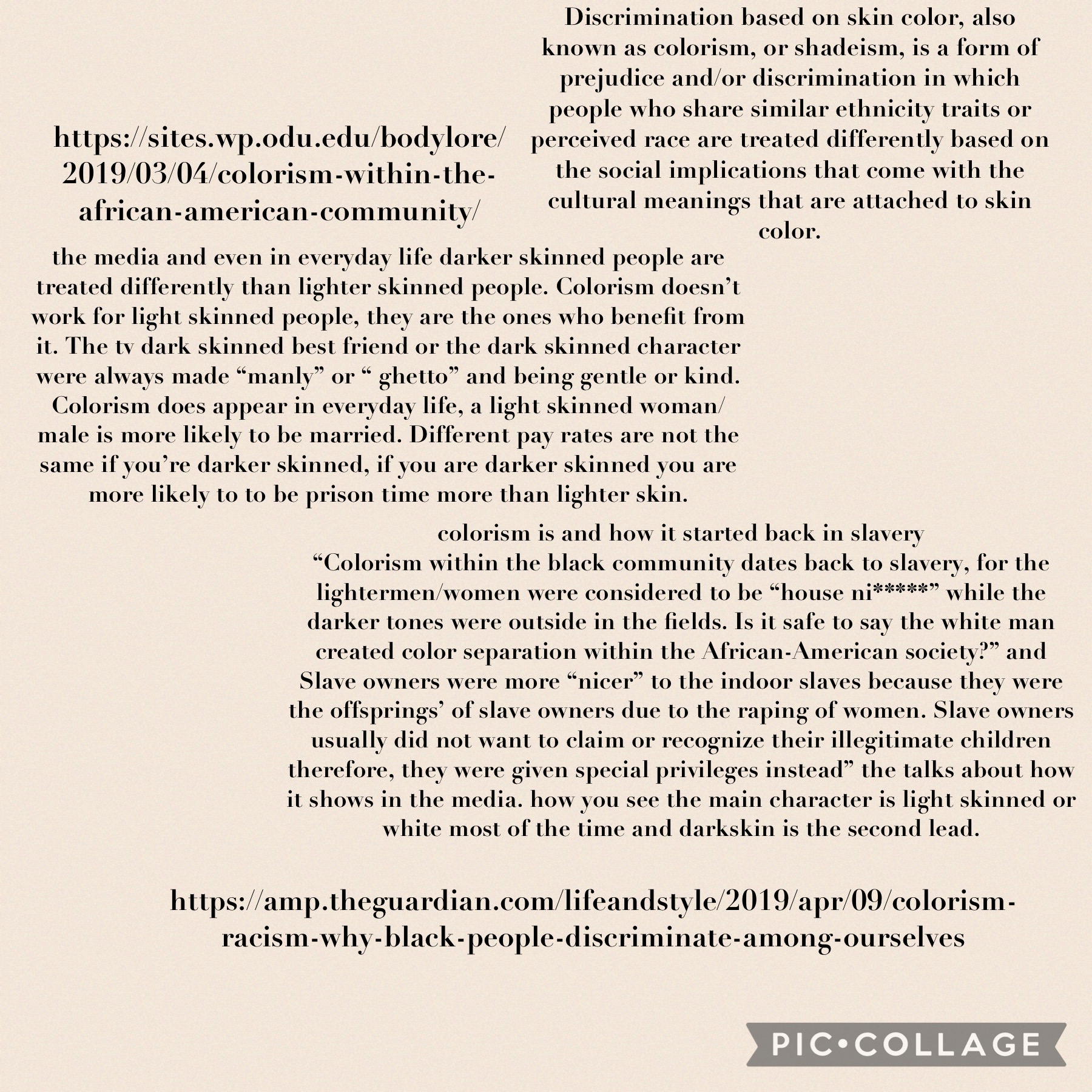 https://sites.wp.odu.edu/bodylore/2019/03/04/colorism-within-the-african-american-community/ This site explains how what colorism is and how it started back in slavery “Colorism within the black community dates back to slavery, for the lighter men/women were considered to be “house ni*****” while the darker tones were outside in the fields. Is it safe to say the white man created color separation within the African-American society?” and Slave owners were more “nicer” to the indoor slaves because they were the off springs’ of slave owners due to the raping of women. Slave owners usually did not want to claim or recognize their illegitimate children therefore, they were given special privileges instead” the talks about how it shows in the media. how you see the main character is light skinned or white most of the time and darkskin is the second lead.