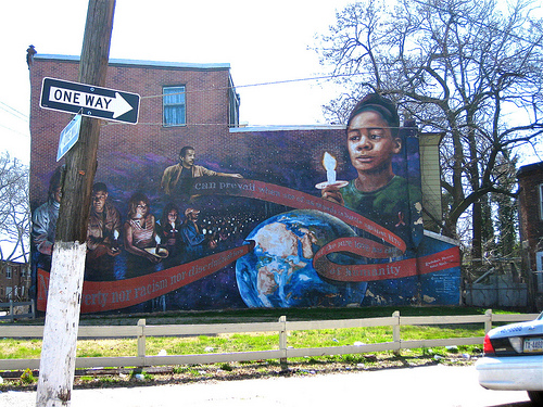 El mural es sobre de muchas personas diferente en la comunidad unificado por la lucha contra de HIV y AIDS. El mural tiene un frase muy importante que dice, 'Pobreza ni racismo ni discriminación puede prevalecer cuando uno de unos es en un lucha con HIV. Objetos encontrados en el mural son personas donde la comunidad y un muy grande mundo con un cuerda rojo largo. El mural es muy significo porque es represente un unificado comunidad estan en contra de la lucha con HIV y AIDS. Tres cosas que este mural revela sobre la comunidad que la es que la comunidad es muy fuerte, los personas cuidan por la salud de la comunidad y los personas en el comunidad son Africanos Americanos.