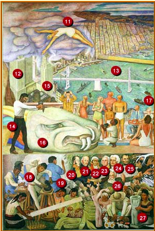 Es un mural muy grande del famoso pintor Diego Rivera. Los colores en el mural son muy diferentes y brillantes: azul , marrón, blanco, y otros colores. El tema del mural es esperanza porque muchas personas diferentes, Hispanos, Africanos, Americanos, y Blancos, trabajaron juntos para construir un futura mejor. Por lo tanto, Diego Rivera pintó el mural mostrar una foto de una mezcla de personas trabajando juntos y inspirar otras personas.