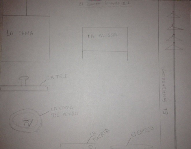 En el cuarto grande hay una cama, un enorme guardarropa, una cama de perro, un tele, una mesa, una puerta, y un espejo.