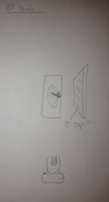 En el baño numero dos hay un lavamanos, un espejo, y un inodoro.