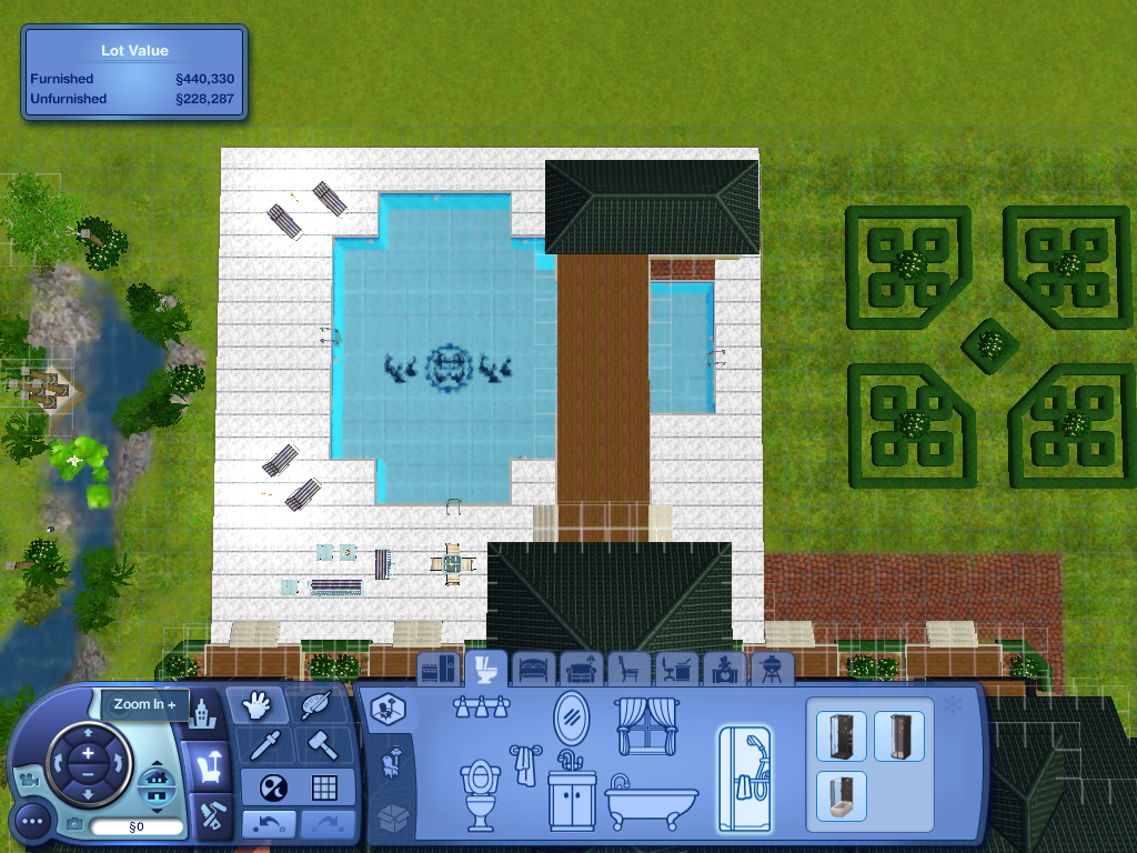 5. En el jardín, un piscina con una cascada grande, mucho sillas, y mucho árboles.