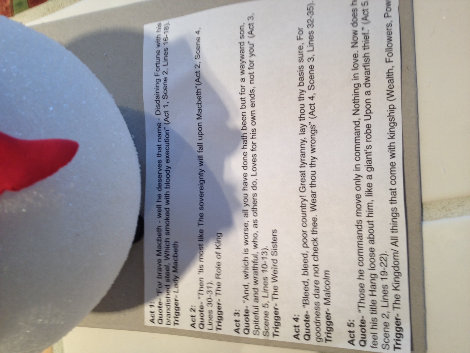 For my project I chose to do a continuation of my written piece. In my written piece I talk about how Macbeth was not always a bad guy. At the beginning of the book he was a good person. It was only through being provoked and triggered into changing that Macbeth changed his personal traits and became such an evil person. To represent this I started by making Macbeth's head. The head that I made is similar to the head that is shown at the end of the Macbeth movie. Then to show all of Macbeth's triggers I made small sculptures of the triggers and placed them on Macbeth's head to symbolize the fact that Macbeth was only taking action based on what other people inspired him to do, not because his own brain told him that these actions were okay. For Act 1, the trigger that I chose was Lady Macbeth; for Act 2, the trigger was the crown and the role of kingship; for Act 3, the trigger was the Weïrd Sisters; for Act 4, the trigger was Malcolm; and for Act 5, the trigger was the kingdom and everything that comes with being king (wealth, power, followers, etc.). The hardest part of this project was coming up with the idea. Once I had the idea the project was relatively easy. The only trouble I had was deciding which things I would pick as the triggers for each act, and also making the sculptures. If I could do this project again, I would put more work into making the sculptures better.