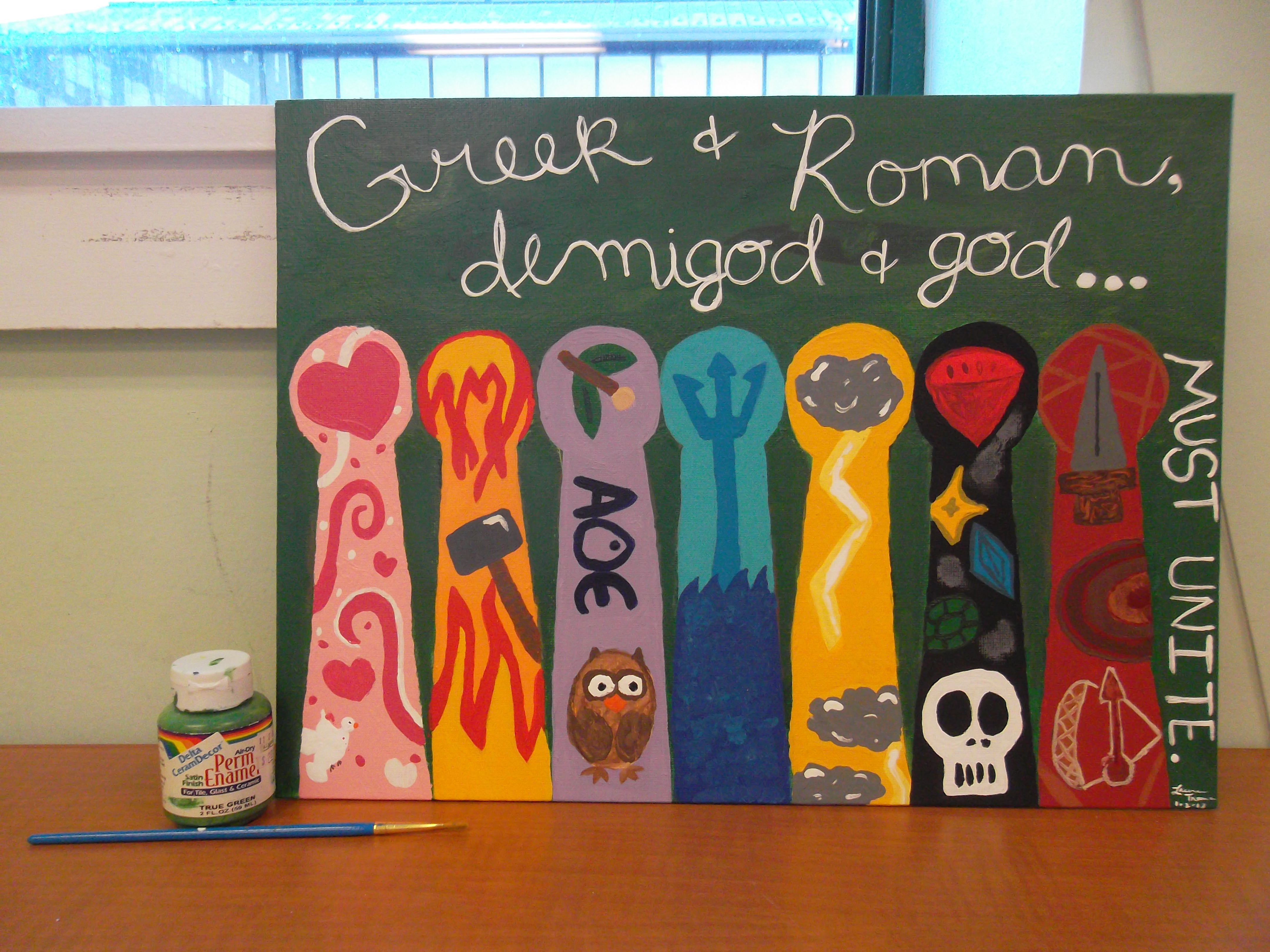 I decided to create a canvas painting on the seven children of the prophecy. Because the main reason of the Mark of Athena is to unite all four worlds - demigod, god, Roman and Greek - I decided to unite them in my painting. I painted each character and their parent in a person-shaped totem. Here is a description of each totem, left to right, and why it is symbolized that way: