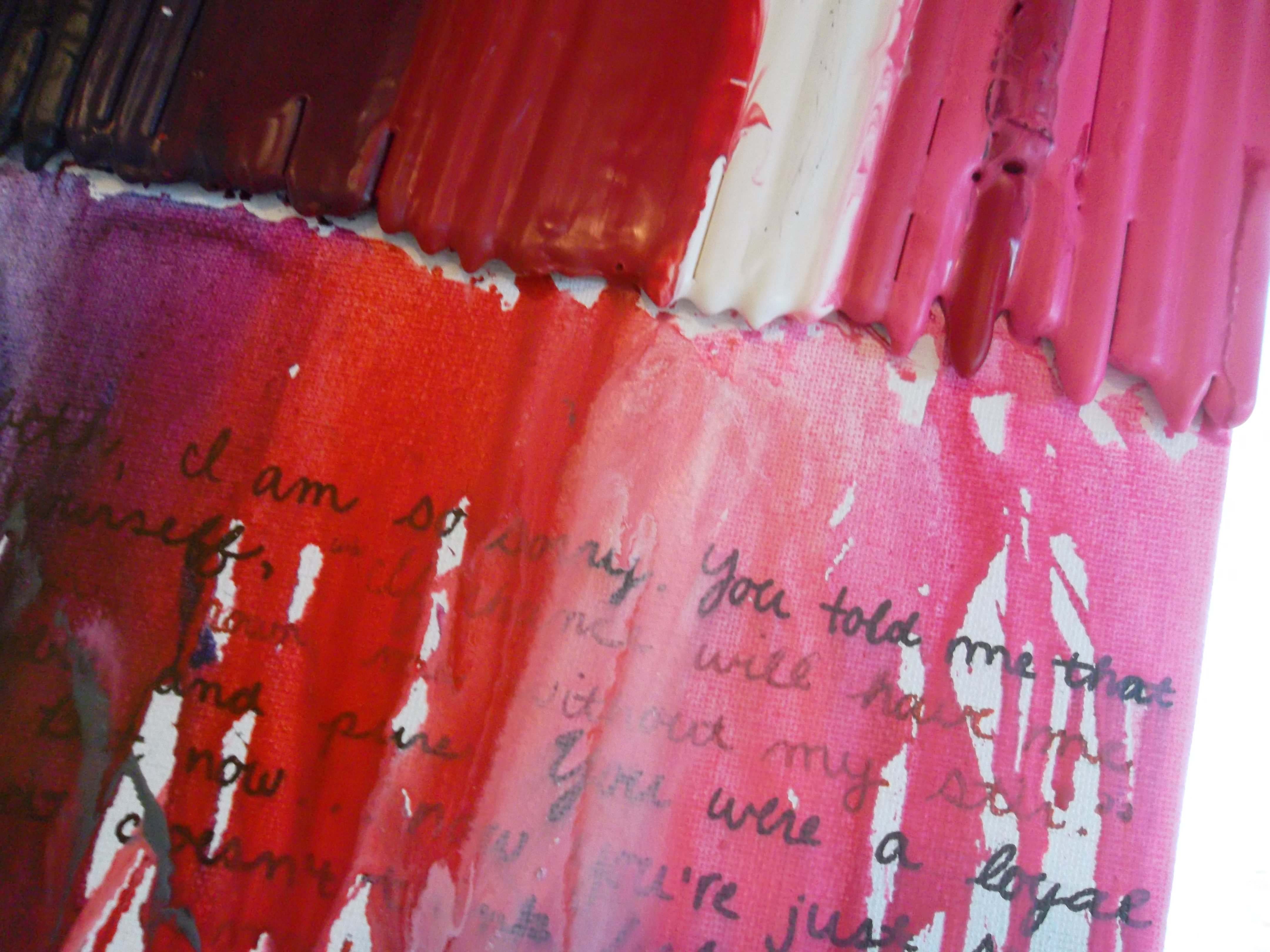 For what couldn't fit into the suicide note, I used the crayons to symbolize. Also, you can't read the note on the canvas because it was done purposeful.