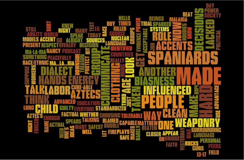 sentences like, “Haha, you’re absolutely right!” While on the other side I heard sentences like, “Haha, you so right!” This generally is how my advisory is, with some using formal English, and more broken down English. My main idea of this piece was that everyone says things differently, from sound, accent, and dialect, we all speak differently. From this I learned that I was capable of writing on language, which I was unsure of before I wrote this. I also learned that we all have different languages, and it goes well beyond English.