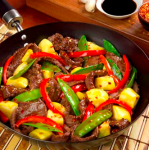 While all the ingredients are in the pan you than mixed them together. Let it set for 1 min. When waiting you can clean the meat after you are done cleaning the meat you than put it into the pan together with the other stuff. When the meat are in the pan you than stir everything together. Since the meat is beef it would only take about 5 min to cook. Let it sit there. As you are waiting for the meat to cook you start to clean all of your vegetables and set them out till it is ready to be put in with the meat. After you see that the meat is close to finish you put in all the vegetables in with the meat into the pan. While you are cooking it together you would want to cook the vegetables nice and soft. So you stir it for 15-20 mins. After 15-20 mins your meal is cooked and its ready to be served.