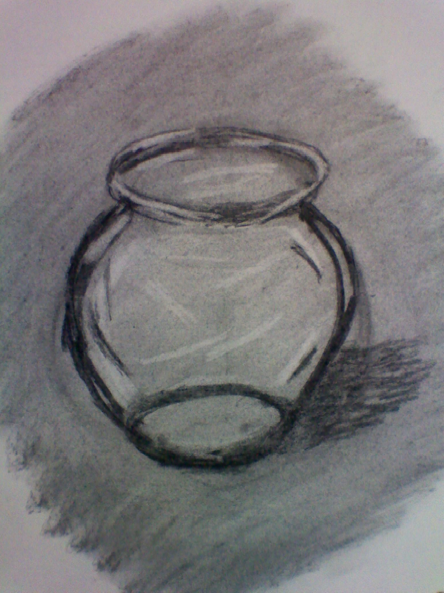 This is a picture of an clear object of a glass. i drew this picture by using a black charcal and shading the white paper than i had grabed a paper towle and stated to rub it on to the charcal to light it up. Than after that i started to sketch my modle, and after i finished my picture i started to use a pencil to erase some of the parts so that it can look 3D, and real life. Also you can see the parts that i erased and some parts that i had darken up. than you can see that i had made a shadow on the side of the glass so that it can show where the light was shining at, and the light marks where the parts where the glass was shining at. But other than that, there is a picture of what i drew that was a clear and glass object.