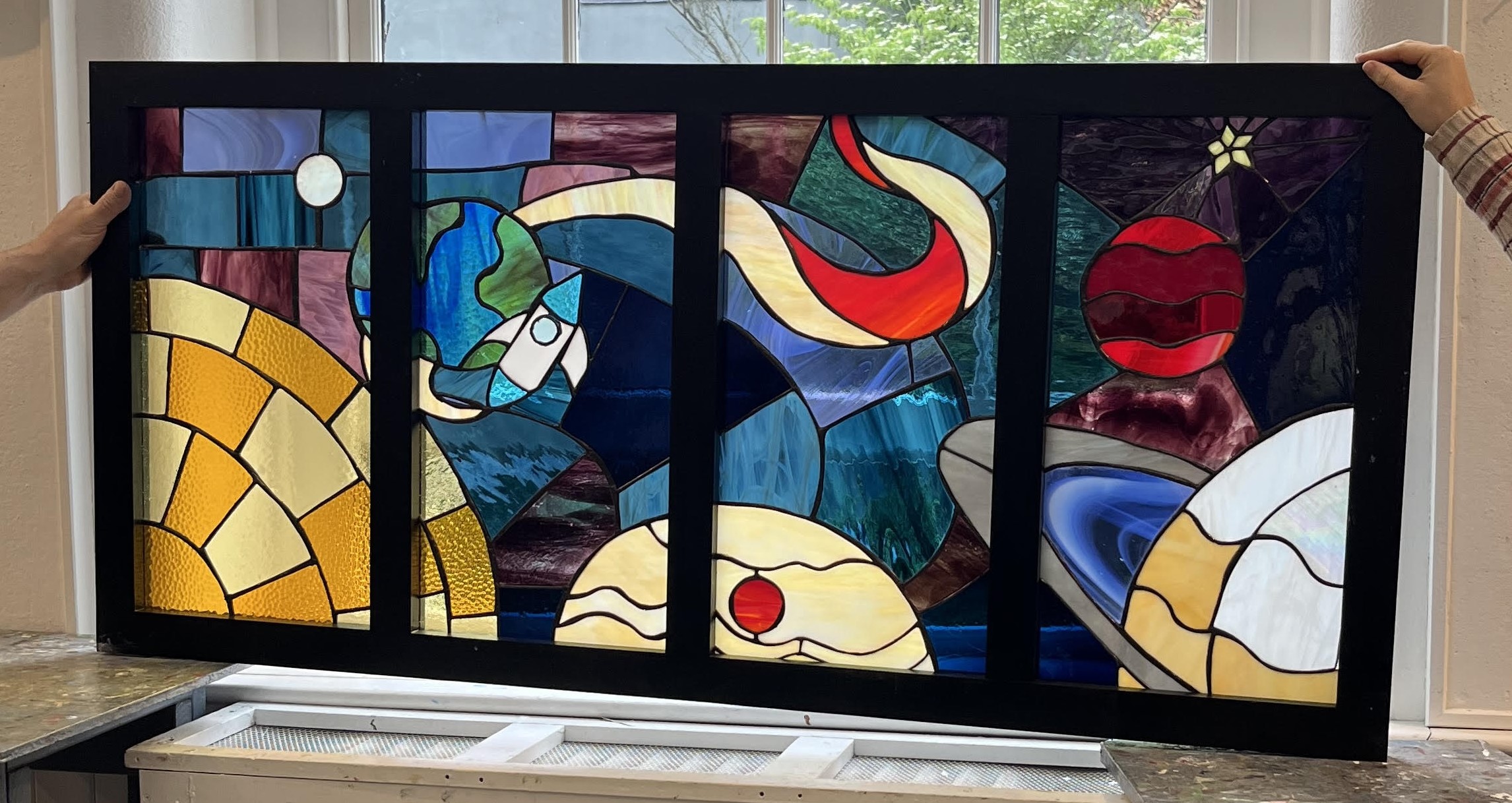 My capstone is an original stained glass window that I designed and created in collaboration with Josie Silver. We worked with The Stained Glass Project, which was also both of our internships last year. The window will be installed in the main entrance of the school building, as a way to welcome everyone entering the community and to make the school a more beautiful place. The space theme is inspired by our school’s mascot, the Rockets. The process of making a stained glass window is very fixed and specific, and also takes a lot of time. In completing this project, I was able to expand on and further develop skills I already had. This was the biggest art project I’ve ever taken on, but I couldn’t be prouder of the finished product. I’m so excited to share it with my peers and the future of the SLA.