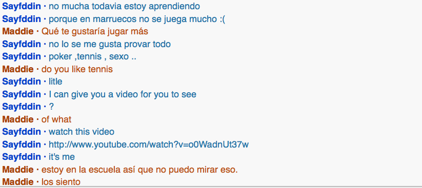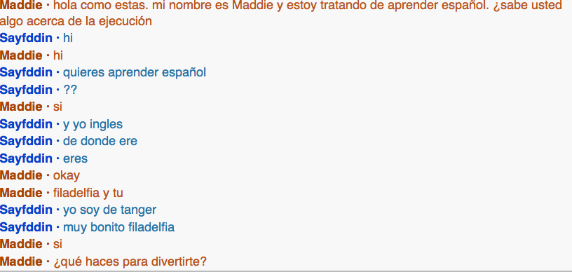 i spoke with Sayfddin from tanger who i meant on share talk. he was 26 and claimed to be a rapper. the conversation was very nice and i feel like i accomplished my goal of holding a conversation past hola como estas.
