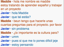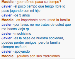 i talked to Javier from spain who was a very nice man and answered my questions and didnt want anything in return. we talked about what kinds of foods he like and what he does with his family. my goal for my second was to talk about what life was like for people in another country and i feel like i could have done a better job with that. but i do feel like i learned a lot about Javier. over all i was very happy with my conversation.