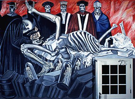 En la obra de arte, todos de los esqueletos representan cosas diferentes, como los dios del mundo moderno. Así lo veo, tal vez el esqueleto en el centro del mural acaba de dar a luz. Cada de los esqueletos del cada dio me parecen son muertos, significado las creencias de la gente sobre los dios también se mueran. Pero el esqueleto pequeño del bebé para mi representa un dio nuevo que toda la gente admira, como un bebé real. También los bebés en tarros pueden representar nuevos dios y ideas. En el fondo del mural el cura y los licenciados simbolizan el retiro de los dios del mundo moderno, como lo entiendo. Al final, los libros simbolizan todos lo demás en la sociedad moderna– la gente, la historia, todo.