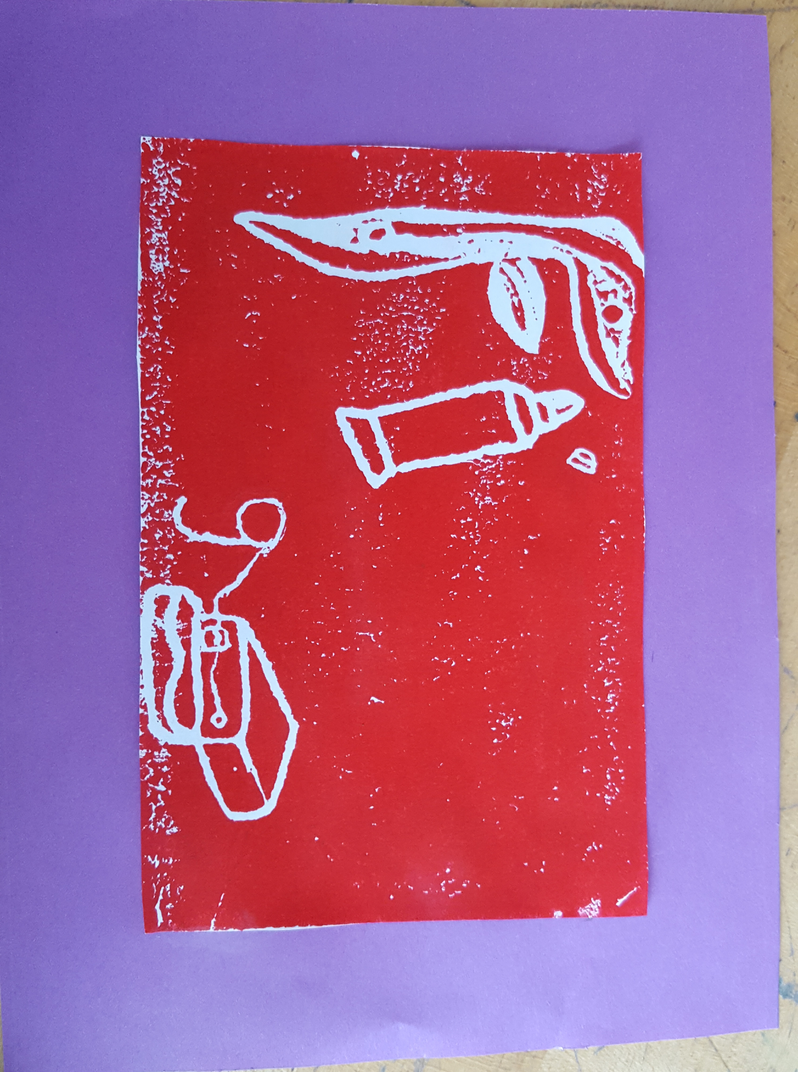 The process I did is to have my design, put it on transparent paper or wax paper, then trace/transfer that onto foam plate. Finally put roll paint on the foam plate that has the design and ‘print’ it on paper.