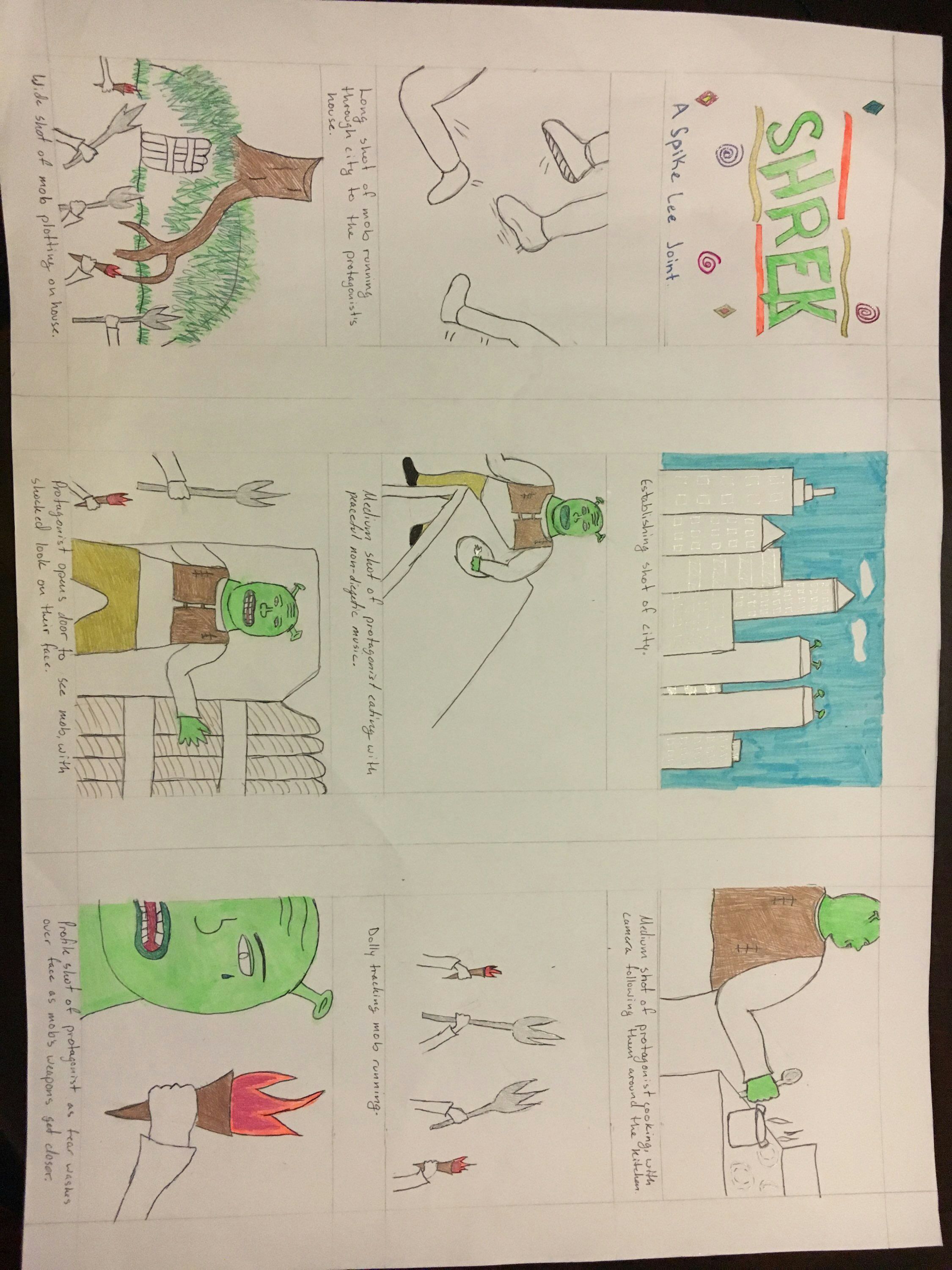 For the re-creation to be successful the focus on Shrek being “colored”(green) would have to be amplified in this case and those attacking him would be remain white as they are in the film. This is shown in the storyboard by Shrek being quite literally the only colored character. The arms and legs of those in the mob are all white and colorless. Since Spike Lee is also known for limiting the information the audience has about those that aren't the main character, in the storyboard the only face shown is that of Shrek. The mob attacking him is represented solely by their footsteps and weapons, as those are the only things that add importance to them in Shrek’s life. Furthermore there would be the use of diegetic and nondiegetic sounds to represent the two different moods in the storyboard. When the mob is on the screen there is no background music, instead the rumbling of their feet, weapons, and the combined shouts of their voices will create the sounds that represent them. Shrek on the other hand will have an upbeat song playing in the background during his time on the screen, to symbolise the peace and tranquillity he is experiencing. The camera will rarely be still, as common for Spike Lee films, with it shakingly following the mob via dolly while gentle and smoothly following Shrek in his house cooking and eating. All this will be occuring in New York since all Spike Lee films occur in urban settings. Shrek’s house will be located at the bottom of a tree in a park to further solidify he is an outcast from this white society. The storyboard ends with the weapons belonging to the mob moving closer onto Shrek slowly, since Spike Lee commonly uses background music even in slow parts of his film there will be a sad song letting the audience know that Shrek is now at the mercy of the mob. Originally this scene takes place in the beginning of the movie and in this case it will as well, this will allow it to set the mood for the film and show the racial tension in the setting of the film.