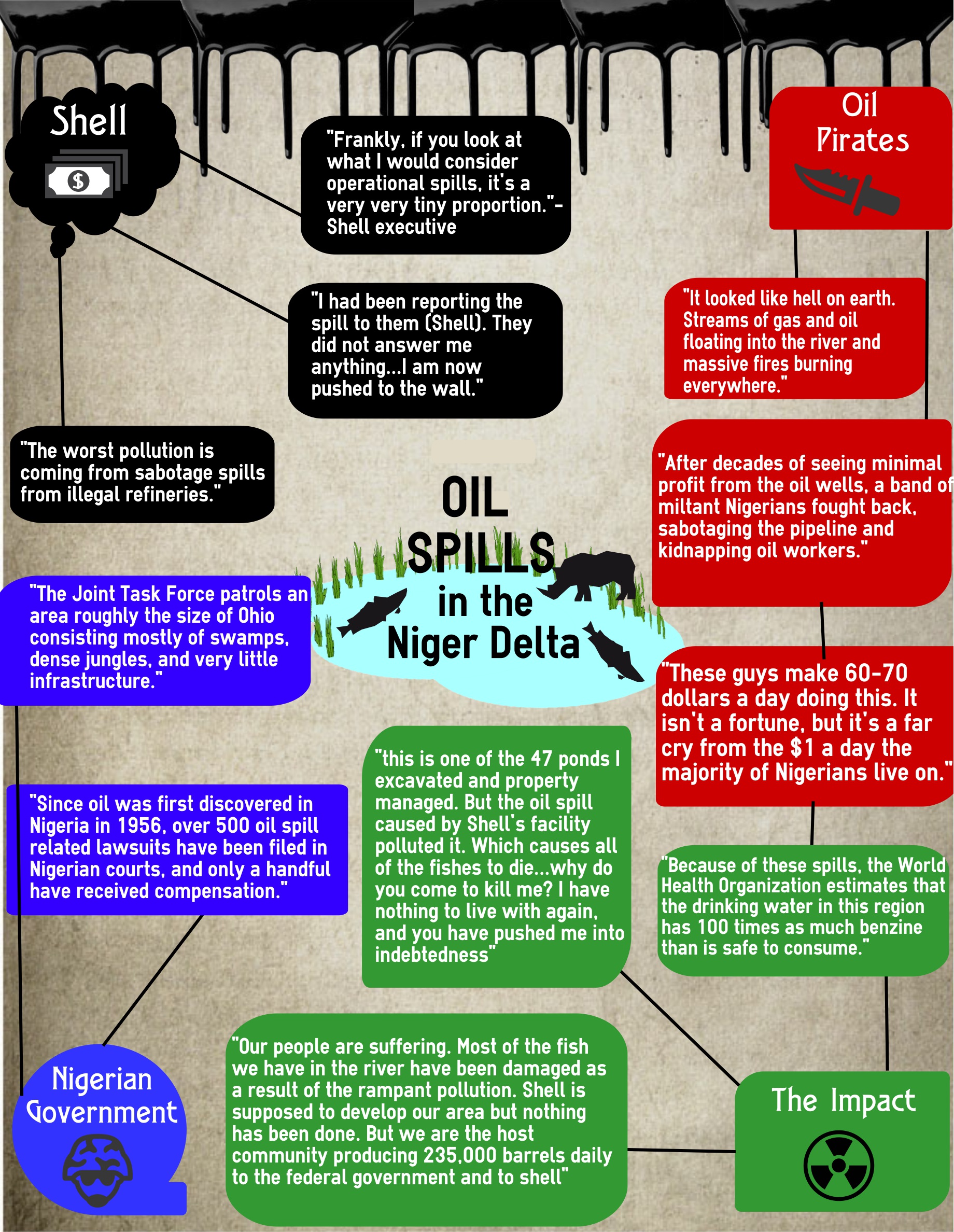 In this graphic, I pulled quotes that explored the perspective of the pirate, Shell, and the Nigerian government. No matter whose fault it is, it cannot be denied that all of these oil spills have been disastrous of the people of the Niger Delta. The water is unsafe, but they rely on it to survive. The fish in the rivers have died, and it's very difficult to get clean water. These oil spills are killing people, and it's time for the guilty parties to take responsibility and clean up these messes.