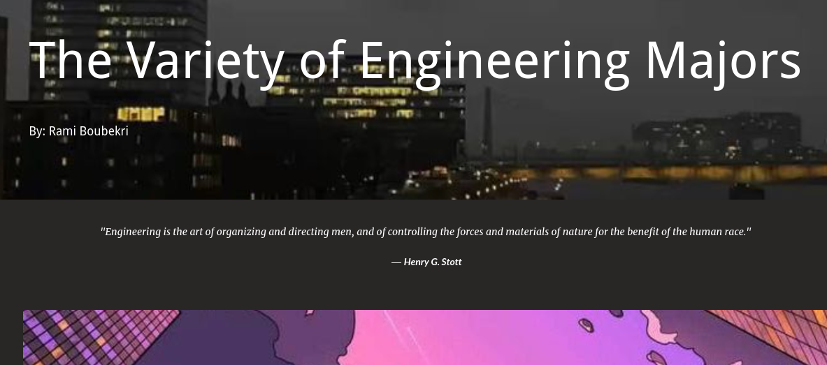My Capstone project revolves around creating a comprehensive website dedicated to Engineering Majors. The primary objective of this website is to offer in-depth information about different engineering Majors. The process of my project was very straightforward but I encountered minor problems like picking the main platform to make my website which took me to try four different platforms to find the one that suits my style of writing and represents my skills. My motivation for making this website was to help upcoming engineering SLA students, The website aims to provide valuable resources and insights that will aid students in selecting the right engineering school for their academic pursuits. Also, Driven by my own experiences as a student with a keen interest in pursuing engineering in college, I embarked on the creation of this website as a valuable learning resource for myself. I wanted to make my capstone that could personally benefit me in my journey, and I wanted to learn something new and impactful. The key component in making my capstone is a lot of research about each Engineering major, but I also added things like interviewing both my uncles that are Engineers and asking them about their experience in the industry and both of them had two completely different answers. Also, I conducted interviews with a group of ten students consisting of five sophomores and five juniors, all of whom expressed unwavering certainty regarding their choice of Engineering major for college.