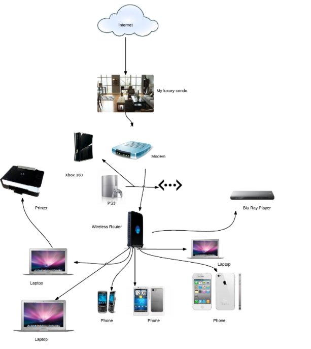 My entire home network is connected to the cloud, or the internet. This comes into my 'luxury condo' (even though I just live in a nice little town house) through my phone jack. This connects to my modem, given to us by Comcast, which administers the cable to my tv and the internet to my home. The modem is then connected to our wireless router (Though it's still called 'NETGEAR', it is very secure and password protected). Connected to the modem and the router is an ethernet cable, which administers ethernet to our xbox and our ps3. All of our phones and laptops are then connected to the wi-fi that the router administers. Our printer is connected to our latpops through wi-fi.