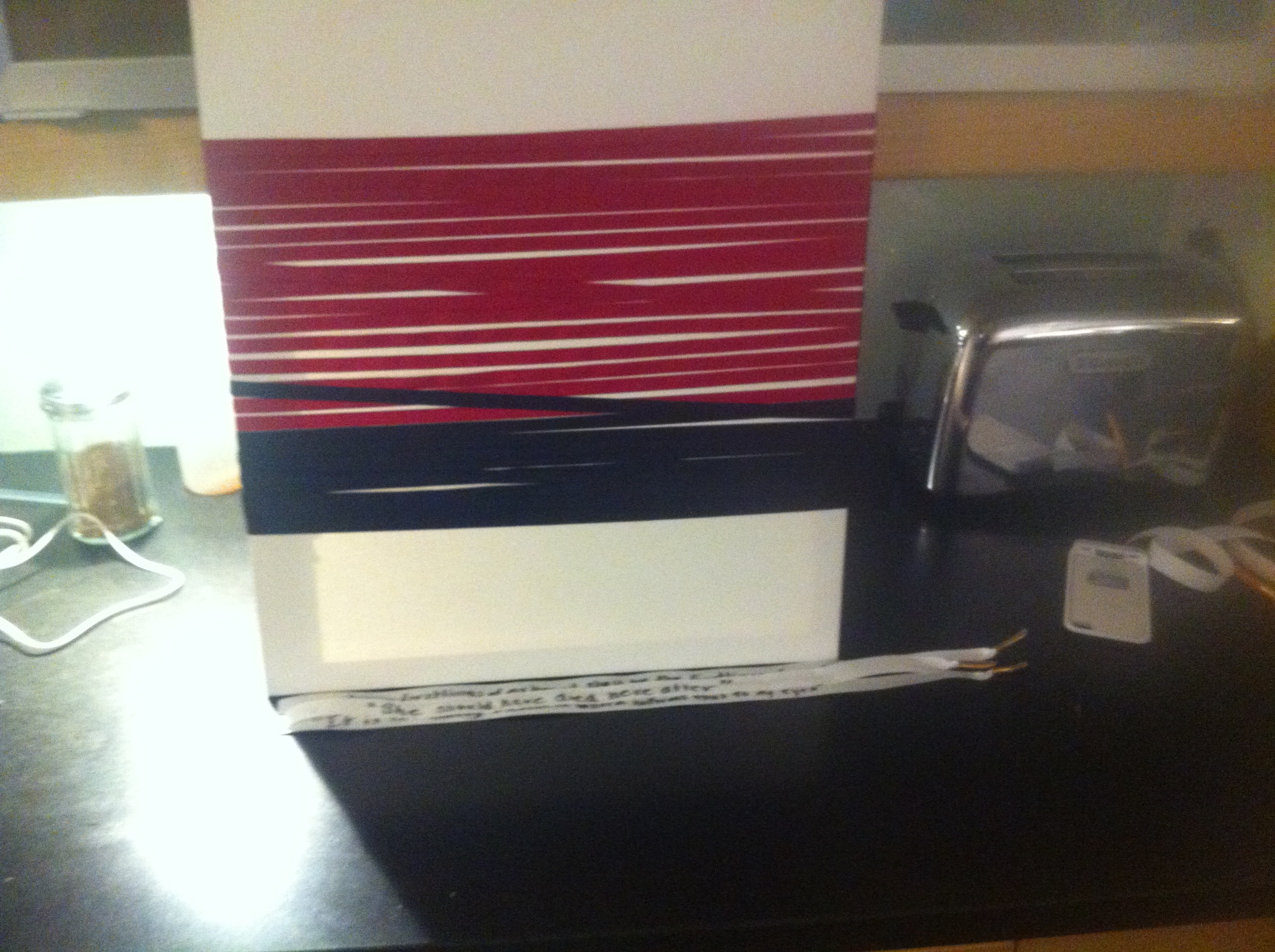 My process with this project was pretty long. I put in about 8 1/2 hours of work for this piece of art. I had to plaster a pair of black canvas vans. Then paint them red. Then let them dry. After I had to paint the back half black. Then after the shoe was done I had to write all 5 quotes on the nylon ribbon. Then to make the white nylon ribbon look like shoe laces, I made gold lace tips. Then on my canvas board, I hot glued red and black ribbon to the canvas and made them intersect at one point to show the transition and change of Macbeth's character. Once all the glue was dry, I glued the shoe to the board and the laces crossing the shoe.