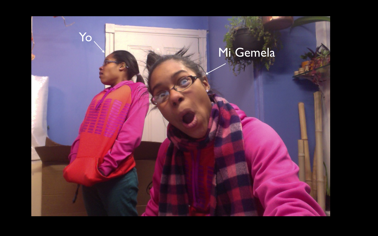 Nosotras: Este es soy y mi hermana Tiarra. Nosotros somos gemelas. Tiarra es muy inteligente pero ella es súper alegre. Nosotros somos muy inteligente, deportista, y bobas. Nos gusta practicar deportes, correr, bailar, comer y trabajadora. Ella es importante para mí porque es mi familia.