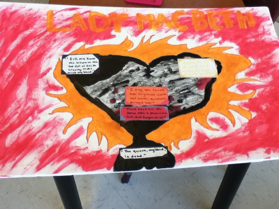 My project is an art piece that depicts the heart of Lady Macbeth. Because of Lady Macbeth's evil desire for riches, ultimately she was left powerless and under the shadow of the tyrant master of her own guilt. In this piece, the heart as the center focus. Around the heart are flames, which symbolizes the range of emotions that compassed her. Also, the background is red to signify the innocent blood that she shed.