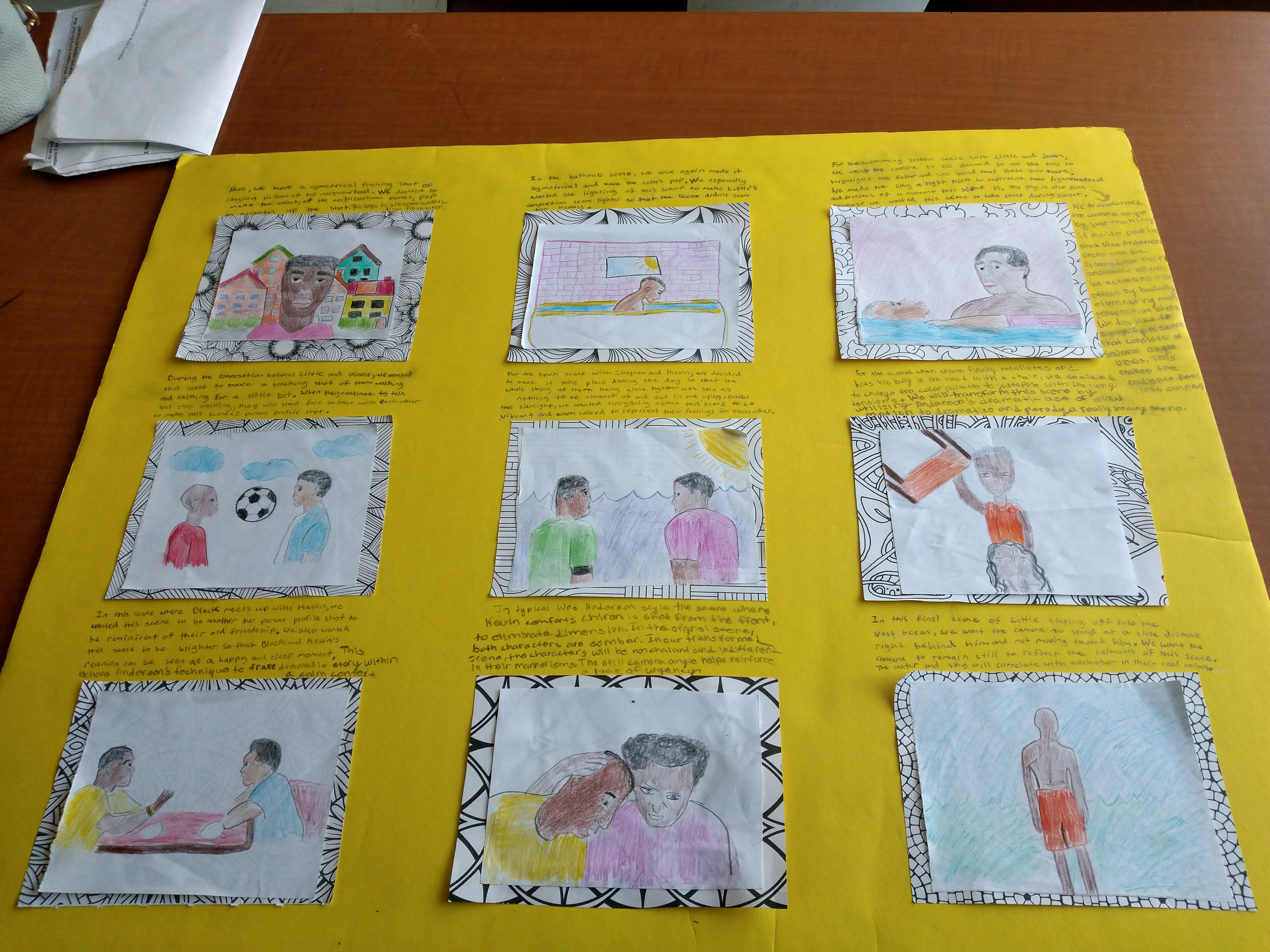 With Moonlight, we decided to use Wes Anderson’s style of directing to take the audience’s attention away from the harsh backdrop that is Chyron’s neighborhood, school, and home life, and instead focus the attention on the better parts of Chyron’s coming of age story. Through color and framing, we used our storyboard to communicate just that. In each panel, we drew pictures that involved vibrant colors and our desired camera angles. We drew a lot of wide/ medium shots, zoom, and made the backdrops pop with warm and cool colors. In terms of positioning characters, such as Kevin, Juan, or Chyron, we drew them face to face to highlight whatever intimacy they may have. Through these changes, we hope to help audiences remember the better and pure parts of “Moonlight” rather than just the harsh backdrop of Chyron’s life.