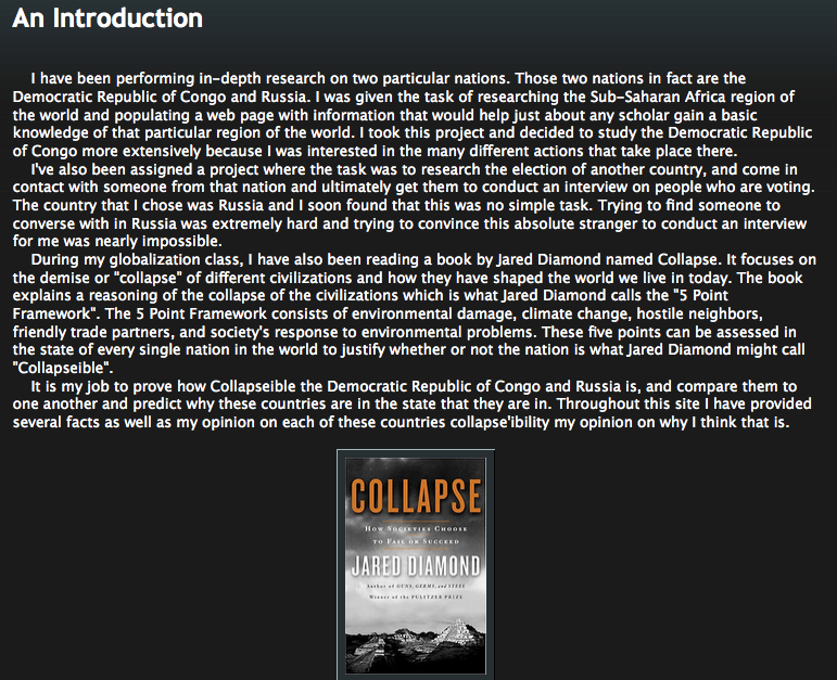 My Group's election country was Russia. Our Election was in early March and we tried several different ways of coming in contact with someone over there to conduct interviews. We emailed an english speaking school over there, as well as we tried to get in contact with luke van meter's brother who actually taught over there. We tried following up with these actions but they were to no avail.