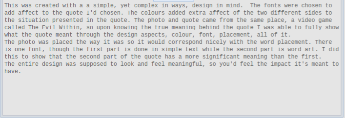 I’ve been writing since I was in grade school. I was published by third grade, in a national poetry book for students. When it came time for the capstone in my final year at SLA, I knew I wanted to write something. I took the idea of writing a book and kind of ran with it. It would be titled Eat. I asked for submissions in the advisory memo, and on social media, and ended up with a few written works from people I knew online. The submissions were placed in a section of the book titled Moving Forward, dedicated to personal struggles and issues people have faced. This particular section is a combination of music, famous poems, personal works, and submissions. There were two other sections to the book, In Time and A Continuous; In Time being dedicated to time stamped things I’d written late at night or randomly throughout days, while A Continuous is simply things I’m proud of, and occasionally things I’ve had published.