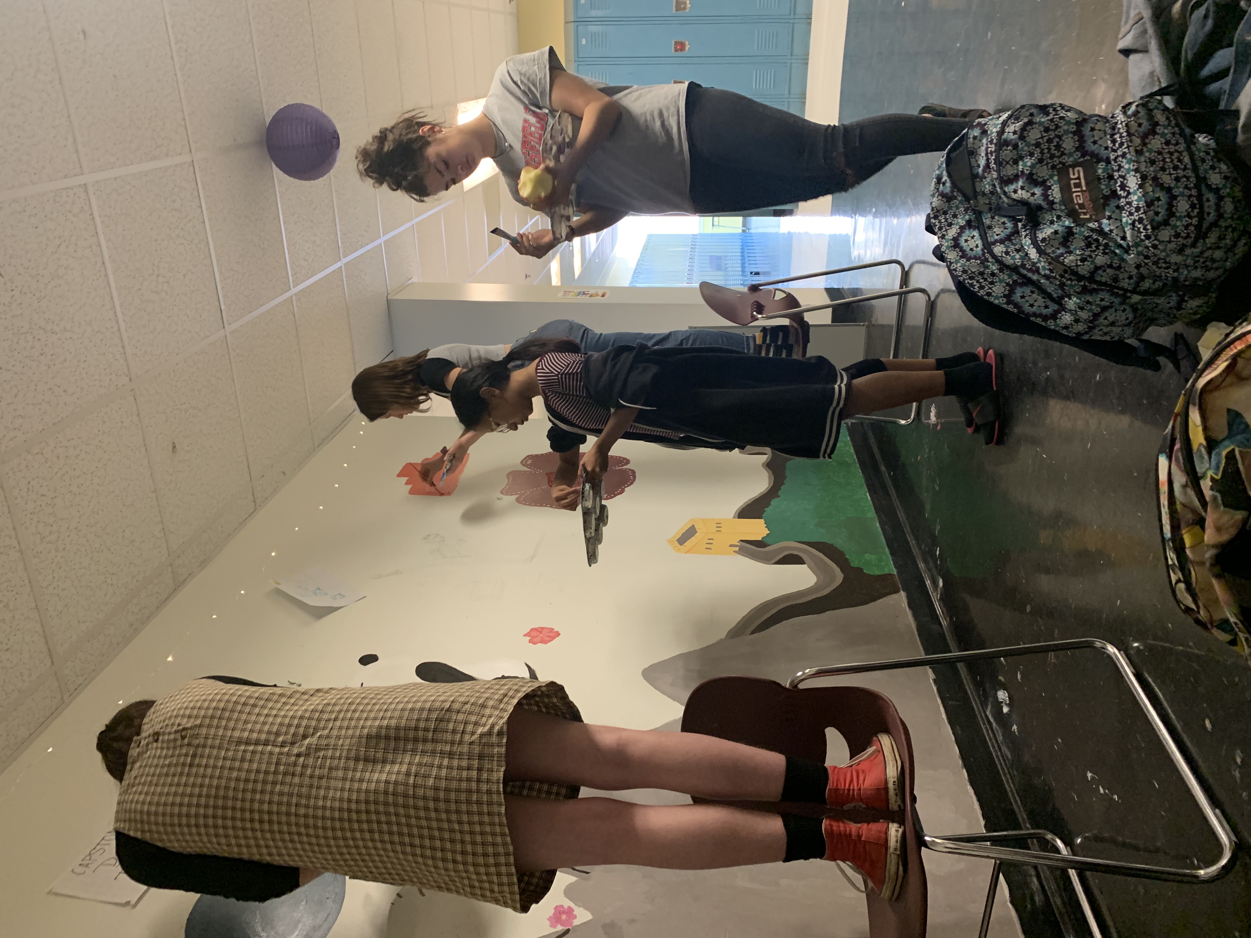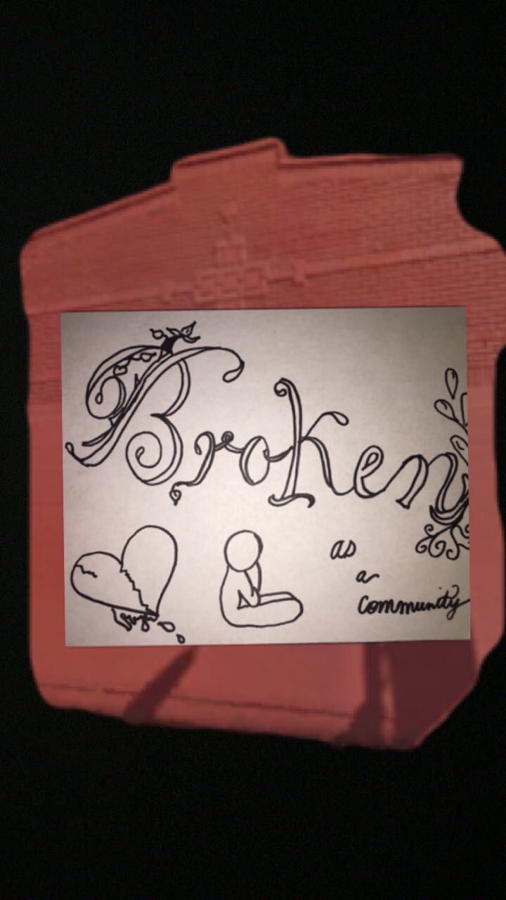 Los diferentes elementos de mi mural que hay son las enormes palabras decoradas con enredaderas y hojas es "ROTO" debido a que mi comunidad es sólo eso. Siguiente, tengo en pequeñas palabras "como una comunidad que muestra claramente que estamos rotos como uno. También, tengo un corazón roto con sangre por toda la sangre derramada en mi comunidad y que rompe mi corazón. Finalmente, tenemos a la persona solitaria pensando en lo que es la vida como solo. Los temas son la tristeza, la soledad, la comunidad, la familia, roto, el miedo y el amor el uno por el otro.