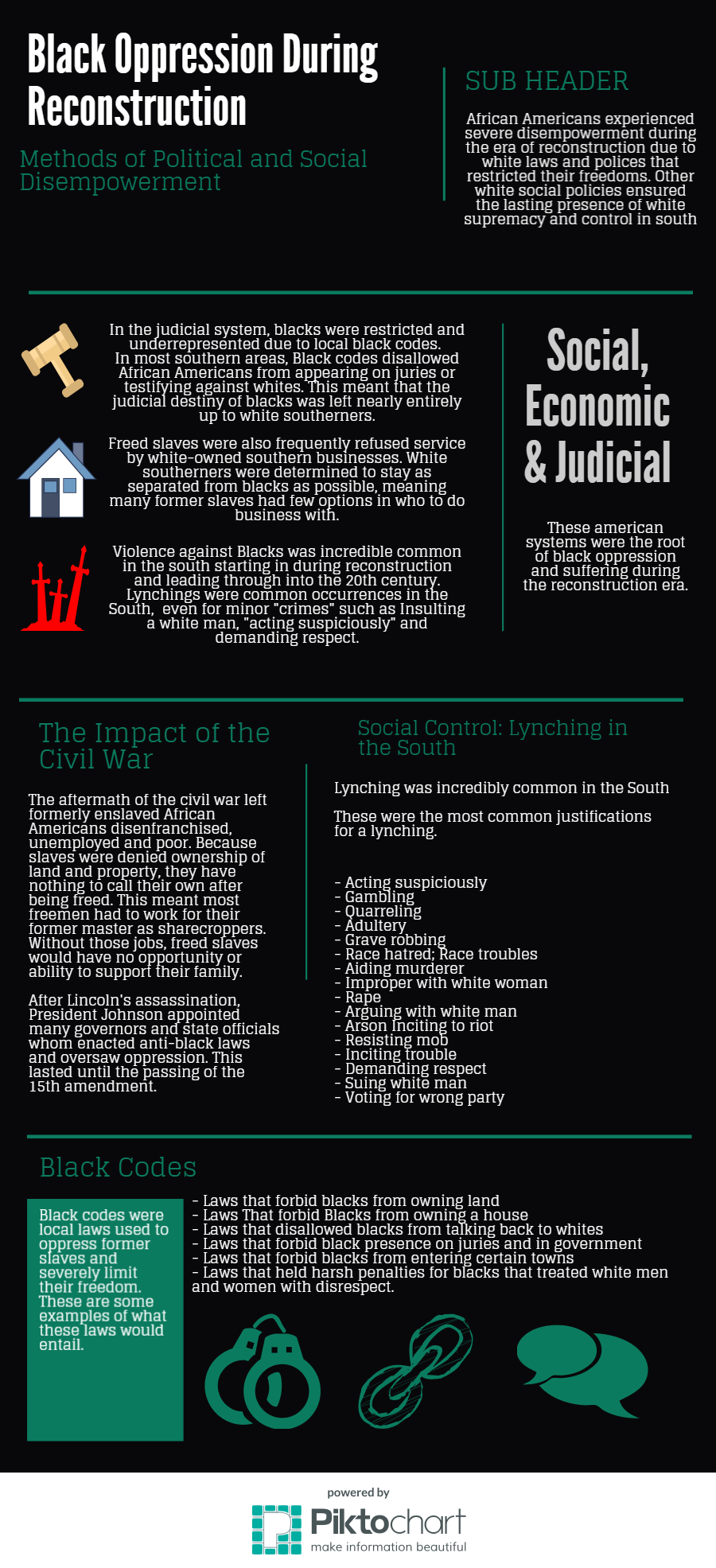 For our visual project, I choose to take a look at the different methods Whites (especially in the south) used to oppress black people in america. Using this infographic, I go over the different ways that former African slaves experienced marginalization, Injustice and oppression in reconstruction era America. I felt that this topic was important because one thing that remains constant throughout history is the oppression of a certain group of people. Whether that group be racial, ethnic, national, ideological or social very similar tools of oppression will be used against all of them. By evaluation and analyzing the methods used by historical oppressors, we can understand the methods future and present tyrannies will use as well.