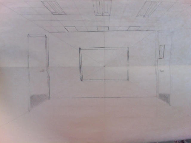 I started with a rectangle. I had to measure my paper to get to find the center of my paper and from there make my rectangle. Then I put in the details. i started with the four line going to each end of the paper. After that i made my vanishing point, which The hardest thing was to draw the details.