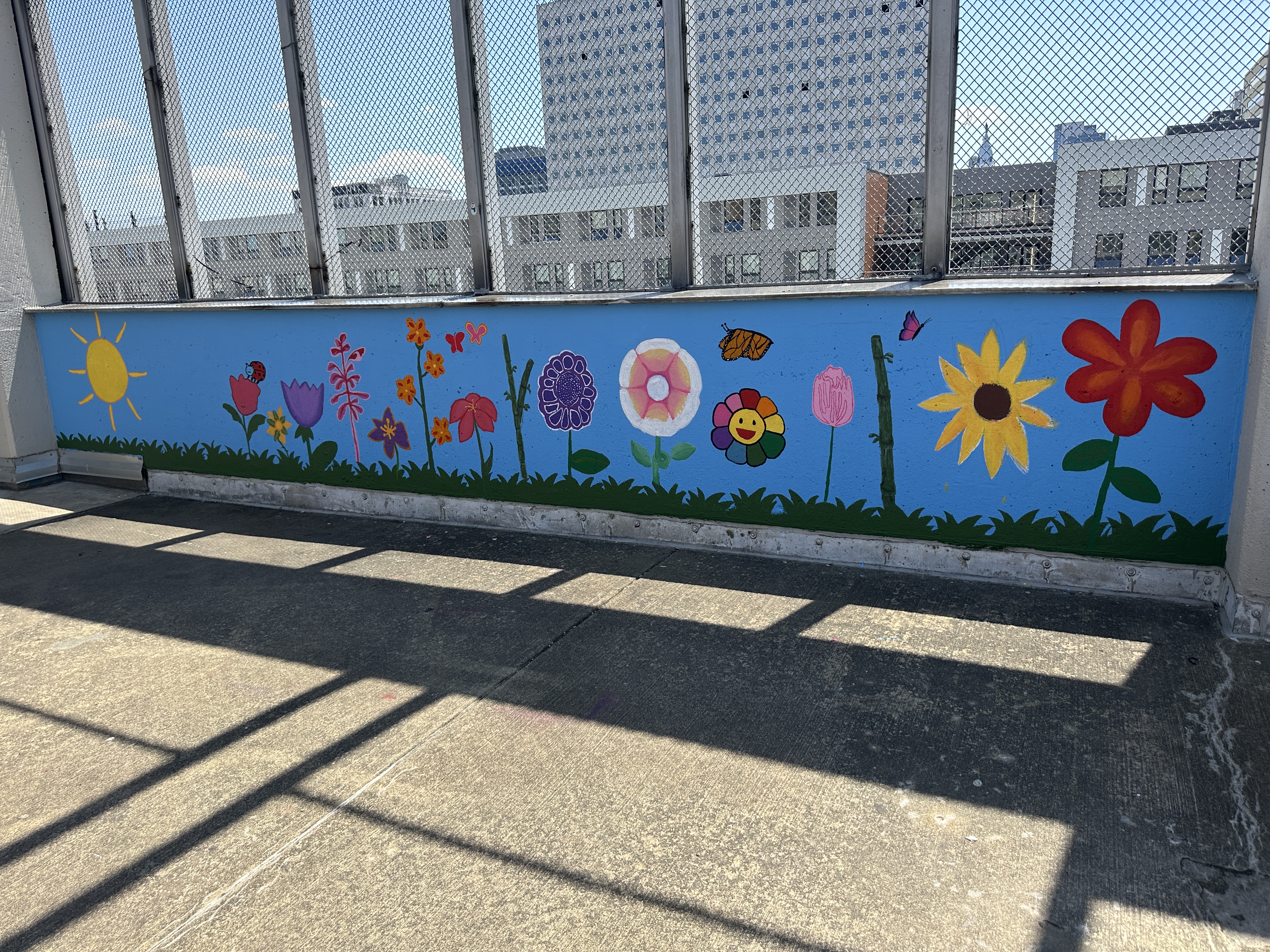 For my capstone, I painted a collaborative mural that allowed all students interested in participating to add their own unique touches and a lasting impact on SLA. Over the course of one week, I began painting this mural and had countless SLA students add their own additions and flowers to it. I began the entire process by hosting a “Plant and Paint” event with a few fellow students. Coming from an environment that hindered my growth and happiness, I came to SLA in search of an environment that not only challenged me but supported me even when school was extremely demanding. My mural is a perfect example of what it means to change your environment when it doesn’t allow for your own personal growth. I was able to create another space that supported students despite the academic demands of being an SLA student. I learned a lot about the positive effects greenery and just seeing flowers have on one’s mental health as well as the many negative and dangerous effects school can have on a teen’s mental health. I also learned more hands-on skills, like how much longer it takes to paint a mural than expected, as well as how to create large stenciling, even with limited materials. Overall, I am very proud of how my capstone turned out and can’t wait for future generations of students to benefit from the bright energy it brings to the outdoor terrace space.