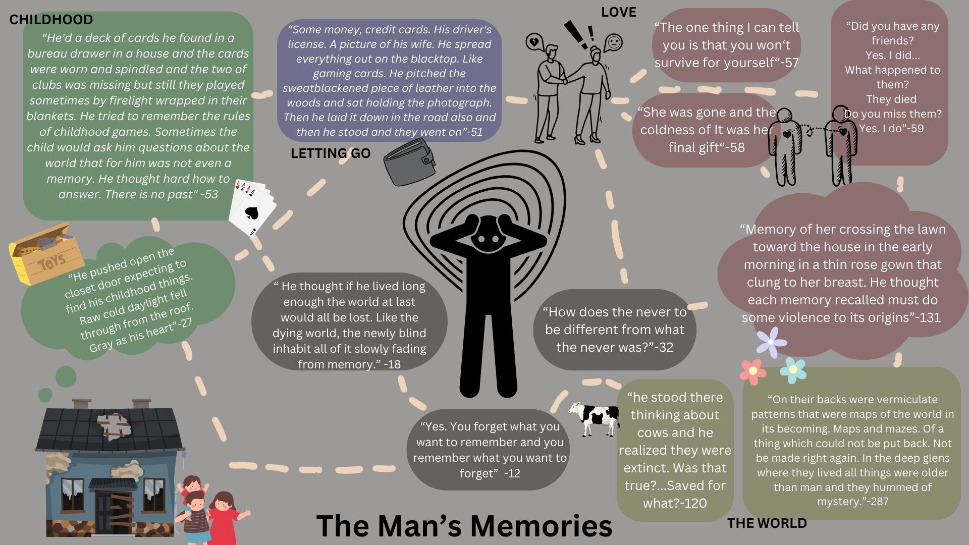The image shows a truck, and the boy was terrified of leaving the “important things the man and the boy left behind. We have decided to change the size of things to show their importance. The tomato can that they left would have been very beneficial to their survival since they always seem to run out of food. The father decided that it would be safer to leave the barn that had food instead of staying at the risk of the owners coming back. The use of “fire the boy was carrying” changed the whole story. If something bad was going to happen, they would say they would make it because they were “carrying the fire.”. This shows that the fire was purely imaginary but had a major impact on the mental health of the man and boy, helping them persevere through the days they spent traveling. Like the fire, the father and son’s belief in God is challenged many times throughout the book. The most memorable time is on page 170, when they meet a blind man who starts to converse with them, leading to a conversation about God going, “I guess God would know it. Is that it?” The blind man then says, “There is no God.” In response, the man says, “No?” getting the response, “There is no God, and we are his prophets.” In the image, the reader can see all the different components that play a role in this book, like the main ones being the fire and the flare gun, since they were great turning points and stopped with the characters throughout the book. The road obviously shows the gloomy setting, and we decided not to color it in to really show how dark and gloomy the setting is by showing little to nothing in dark color or color in general. The mountains in the background also relate to the setting because it shows the rough conditions that they were in since it was cold and we can tell that by the snowy trees mentioned in the beginning of the book.