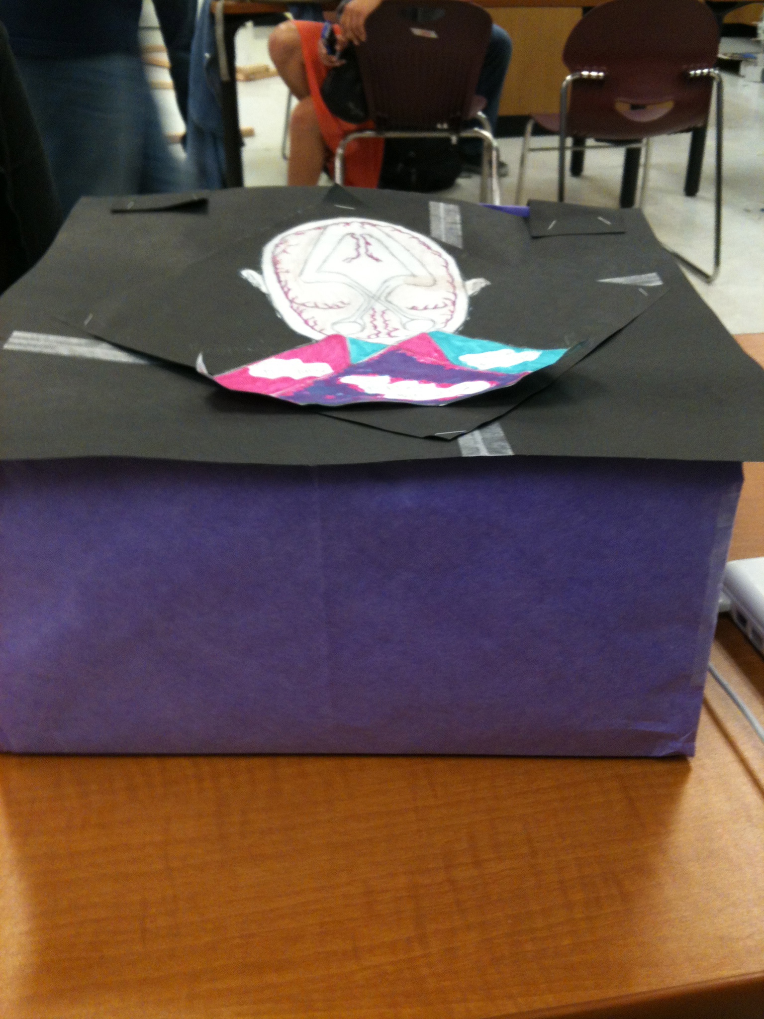For this project I decided to look at the brain in relation to the eye. I have learned a lot about it, the only hard thing was, was deciding how to present the information. There is so much information that I needed a nice way to present that would be interesting. So I decided to make a box, a box that is "like" the brain. I drew a picture of the of top of the box because I wanted people to see what the brain looks like because it is nice to see what is going on. I also decided to make a smaller little black box inside of the larger box because it is said that said "10%" with paper inside it because that is were all the information is "stored" haha. That was just my way of trying to be a bit creative with the presentation. I learned a lot about the brain and what it does, it was nice to understand how the brain works. Most things that goes on in the brain is what people see them to be and how they learn and remember things. Most people remember things better when they relate things to food, smell and taste. I personally relate things to smell because it is always easy for me to remember things by smell because it never changes. I also learned that if someone is trying to problem solve a situation and what ever they did worked the first time, they will do the same thing do solve the problem. That was just a quick speedy version of what I have learned because trying to explain everything I have learned about the the mind would have been too long to endure.