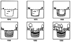 Over time as you can in 1840 it started out as a pond but ended up being a forest. In 1870 you can that some of the plants are starting to get a little bigger and that the fish are still present. In 1900 algae are starting to fill up the pond. 1930 the pond is almost covered now with a tree on the side and algae almost filling the whole thing. In the last two years the trees are more present with the pond covered with algae and dirt.