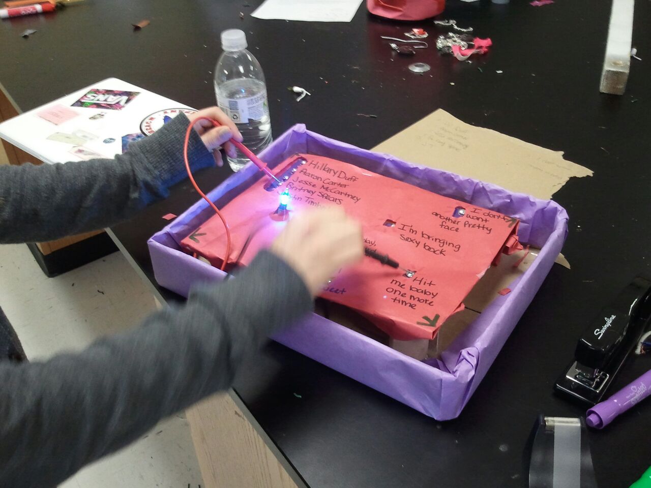 We decided to do our project about music because we felt like everyone can connect with music. We took music from 1990's. During the 1990's everyone was into bright colors, sticking out and being unique, therefore we made our project purple and red with a blue light bulb.
