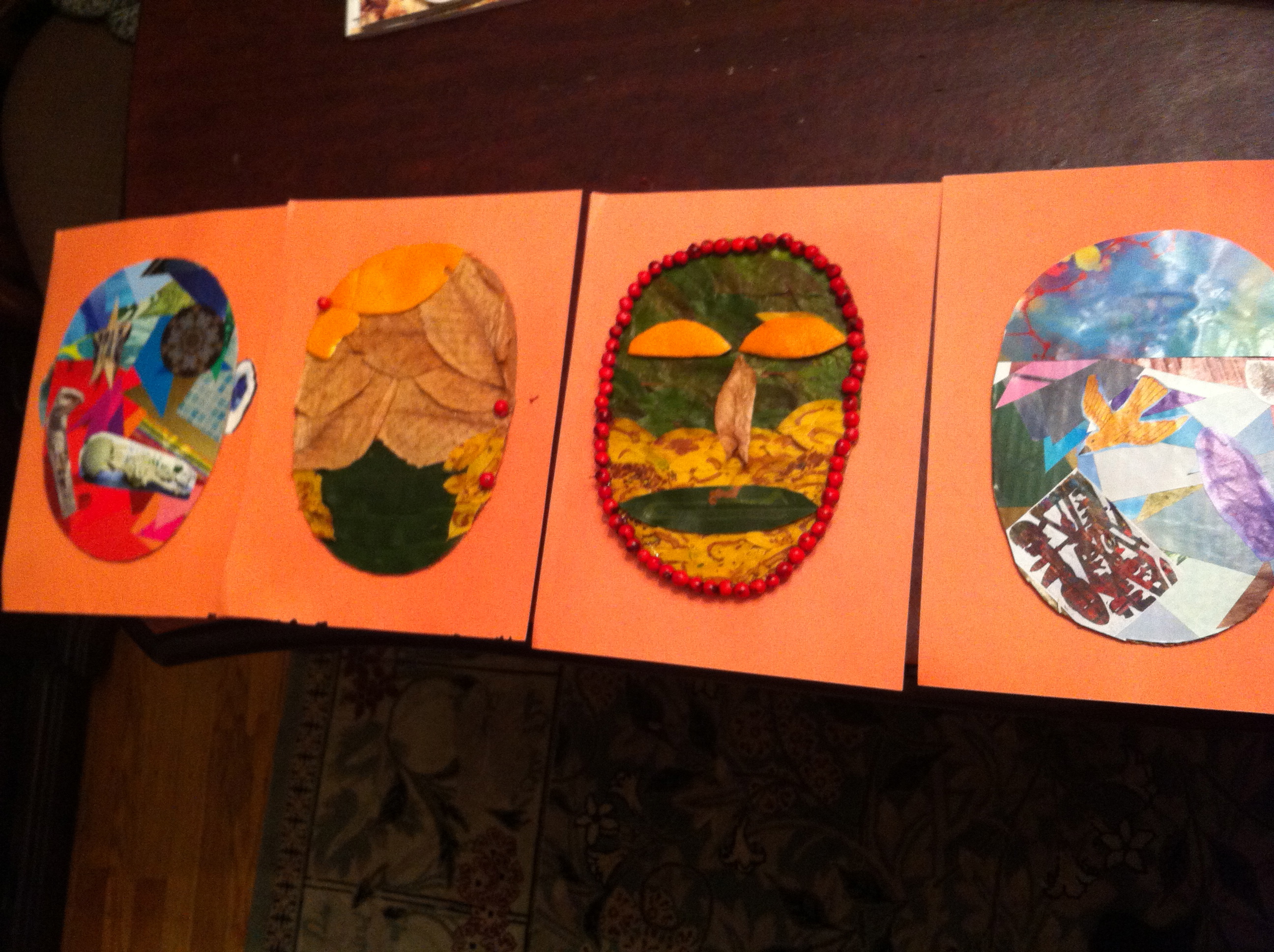 My creative piece consists of four different masks: two being the outer body and the other two being the inner body. Each sets of masks represents a different side of the theme. One mask pairing displays a tranquil outside with a hectic inside and the other mask pairing displays a hectic outside with a tranquil inside. I represented tranquility by collaging my mask with natural and earthy elements. Nature is often associated with peacefulness and restfulness, so I thought it would most accurately symbolize a calm serene façade and/or emotion. I represented hectic emotions by collaging my mask with magazine clippings. I used mostly triangles because they have three sharp edges. To me, the edges displayed the clash and struggle that people often find when attempting to reveal their truest emotions. I also used a combination of warm colors (red and orange) and cold colors (blue and green) because they are opposite on the color wheel allowing for more contrast.