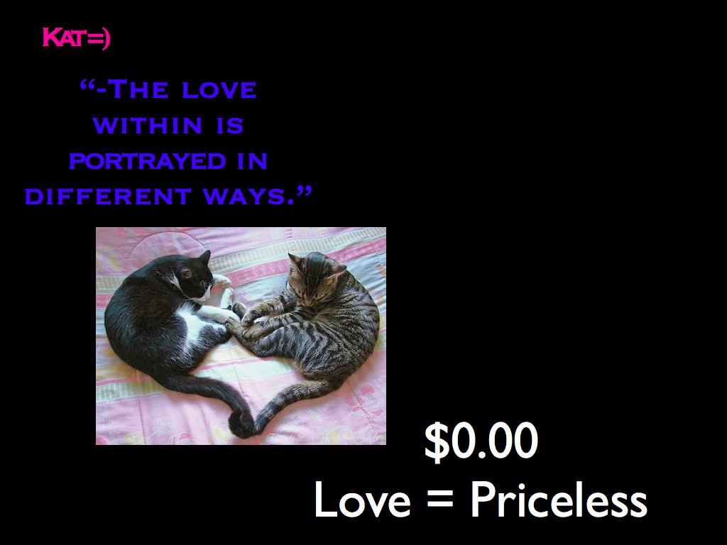 Based on what I learned in class and now that I have presented there are minor changes that were made on my part. The color blue where it says " The love within is portrayed in different ways" was changed to the color yellow , since the background is black. This made it easier for the color to be seen and my personal quote to be read. Also, playing around with where the words where was another change because of the fact that on my first slide it seemed like there was a lot of empty space, which attracted people more to that space than to the words on the actual slide. Last, the fact that the words had effects to them made it seem unprofessional. (For this the one with the changes is